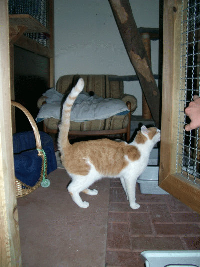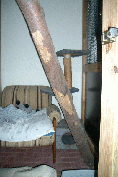 Kratzbaum, Sesel, Baumstamm, Klettermöglichkeiten, Bodenheizplatten und teilweise mit Fenster